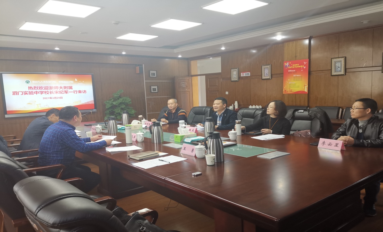 2021年3月25日,浙师大附属泗门实验中学校长宋纪军、副校长方红敏、合作办主任王勇一行来我院交流合作办学工作。我院院长周跃良,院长助理、高质量育人综合改进研究中心执行主任李云星,江干区教育局原副局长、中心副主任费蔚,外派联系专家陈伟强出席交流活动。