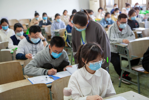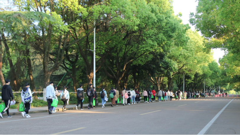 考试当日,工作人员严格布置和检查考场。学生志愿者统一身着志愿者服装,以饱满的精神状态迎接前来参加面试的学生们。考生在精业楼前整齐排队,由志愿者带领前往各自考场抽签侯考。