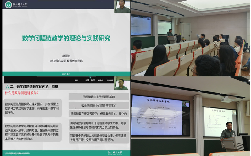 2021年4月21日下午,受华东师范大学亚洲数学教育中心主任范良火教授邀请,我院副教授唐恒钧博士做客亚洲数学教育中心第十五期研究生学术论坛,作了题为“数学问题链教学的理论与实践研究”的专题报告。本次报告由华东师范大学诸方淳博士主持,在华东师范大学闵行区教学楼401教室和钉钉线上平台同步开展,共计150余人参加了本次会议,共收获13200多个点赞。