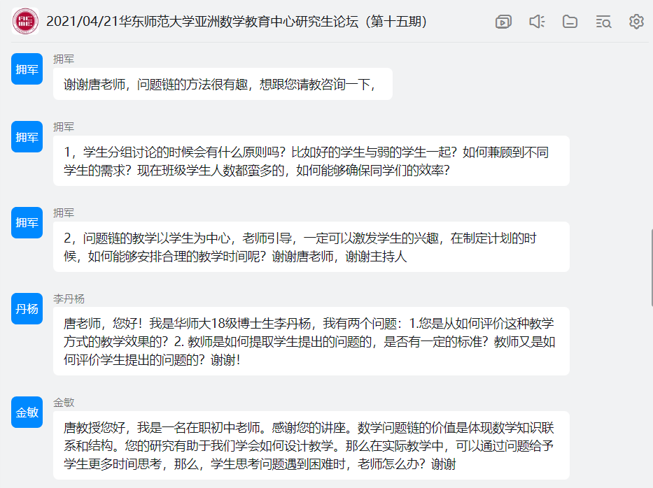 在交流环节中,与会老师与同学就问题驱动、问题提出、问题串等与问题链的关系,新老教师在三种数学关联上的差异,学生的选择与时间的安排,评价教学方式的效果,教师提问的标准,实际教学中遇到的困难等咨询了唐老师,唐老师也进行了细致地回答。本次报告会为数学教育研究人员及一线教师带来了新的思考。在主持人的总结下,本次报告会圆满落幕。