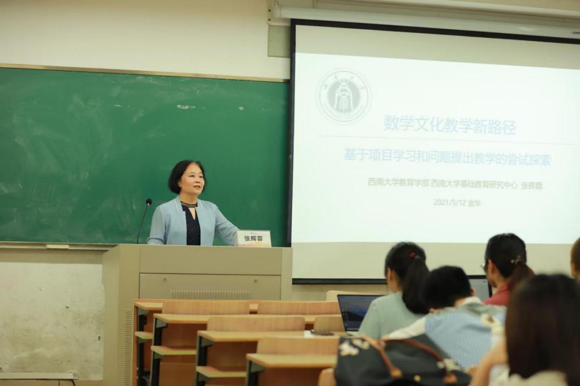 2021年5月12日下午,西南大学教育学部、西南大学基础教育研究中心博士生导师张辉蓉教授应我院张维忠教授邀请,在5幢102教室作了题为《数学文化教学新路径——基于项目学习和问题提出教学的尝试探索》的学术报告。本次报告由张维忠教授主持,课程与教学论、学科教学(数学)专业60余位师生共同参与了此次活动。