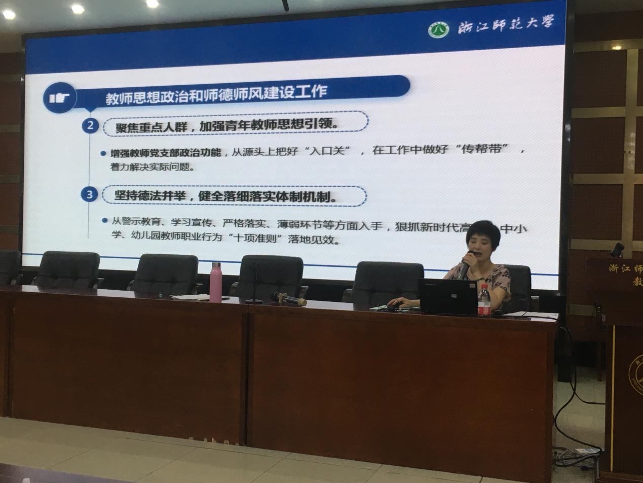 查颖从教育部召开教师思想政治和师德师风建设经验交流会议精神、《浙江师范大学师德师风负面清单和失范行为处理办法(试行)》、全国高校师德师风问题案例通报、案例对我们的教育和警示、《浙江师范大学“师德师风建设落实年”活动实施方案》等五个方面进行详细宣讲。她强调,师德师风建设坚持权责对等、分级负责、层层落实、失责必问、问责必严的原则,各二级单位是师德师风建设的主体责任单位,各二级单位党政负责人是第一责任人,学校对师德失范行为实行“一票否决”,会根据出现违反师德行为的情节轻重给予相应处理或处分,