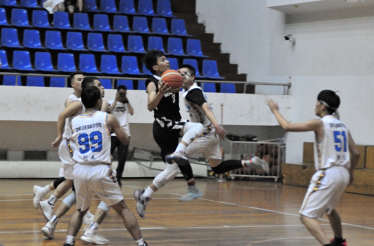 随着裁判一声哨响,比赛双方展开了激烈的对决,众多教院学子也纷纷到至现场,为我院的运动健将们加油打气,呐喊助威。我院篮球健将们在球场上努力拼搏、配合默契,24号艾沙抢断快攻动作迅速;3号张金鑫面对对手强硬防守突破上篮投进三分,取得教育学院校男子篮球赛决赛首分;8号包立松串联全场,多次抢断以及送出助攻……教院球员们的一个个精彩表现博得观众阵阵喝彩。在欢呼声中,队员们乘胜追击,依靠防守与快攻,半场就建立了较大优势。