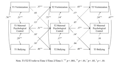 2021年6月,谢瑞波课题组在家庭教育的Top 期刊《Journal of Interpersonal Violence》 上在线发表题为《Bidirectional Longitudinal Relationships between Maternal Psychological Control and Bullying/Victimization among Father-Absent Left-Behind Children in China》的论文(一作为2019级硕士生吴伟,谢瑞波为通讯作者;文章链接https://doi.org/10.1177/08862605211022062),该期刊为SSCI一区TOP期刊,2020年的影响因子为3.573。该研究采用间隔半年的三次追踪调查研究(T1-T3),通过建构交叉滞后模型,考察了7-11岁父亲外出留守儿童的欺负/受欺负与在家抚养人母亲的心理控制教养之间的双向作用关系。研究发现母亲心理控制教养与父亲外出留守儿童欺负/受欺负存在相互作用。具体来说,T1母亲心理控制可以预测T2儿童受欺负,T2儿童受欺负可以进而预测T3母亲心理控制,形成恶性循环。T1儿童欺负可以预测T2母亲心理控制,T2母亲心理控制进而预测T3儿童欺负,又导致恶性循环。该研究关注中国留守儿童这一特殊群体,对留守儿童家庭教育和校园欺凌干预提供了启示。父母的消极教养与儿童的不良行为具有恶性循环的特征,只有通过家庭教育指导才能打破这一循环,才能促进儿童积极发展。
