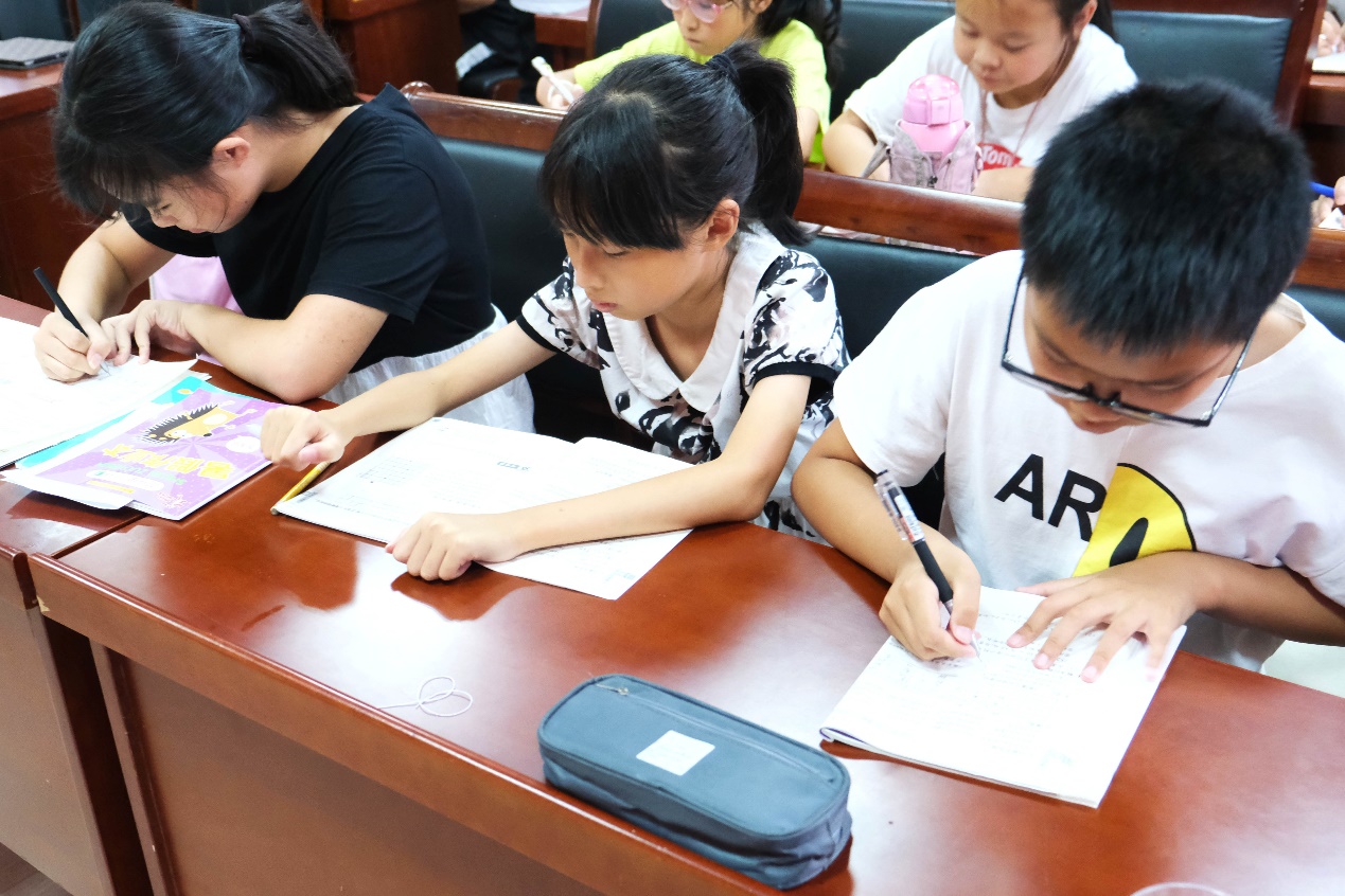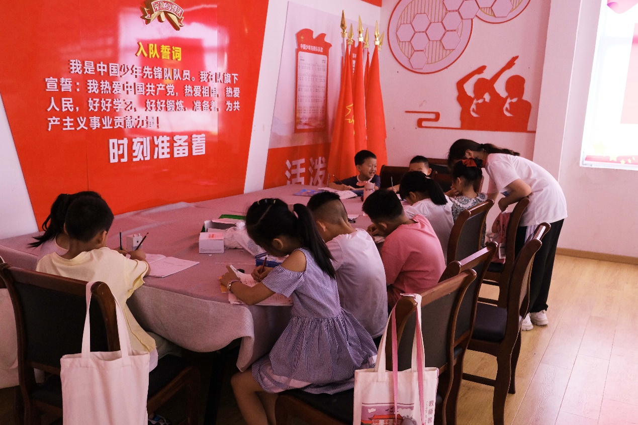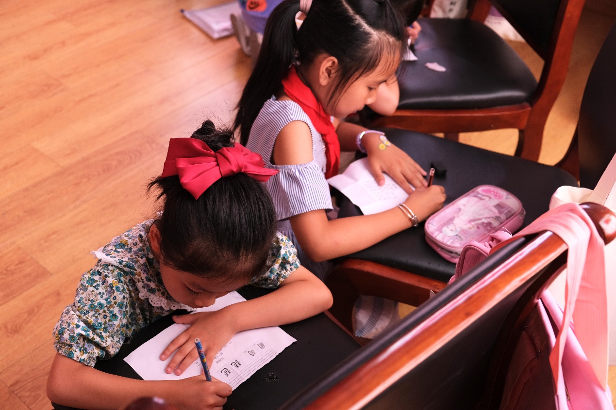 小朋友们拿出自己带来的暑假作业,开始学习。一位位小老师在教室里巡视,为同学们解决困惑。