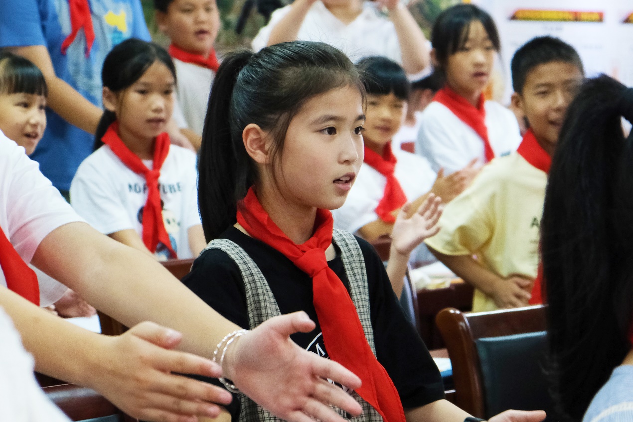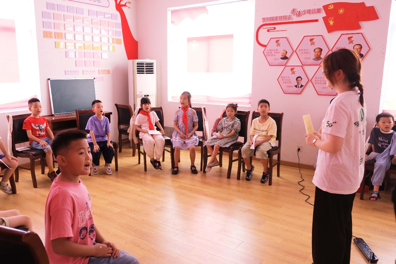 蒋老师不仅是青少年宫外聘辅导员,也是一名音乐老师。她利用自身优势,在课堂上一展歌喉,“我们是共产主义接班人……”她带领学生一起合唱《中国少年先锋队队歌》,让歌声回荡在教室上空。