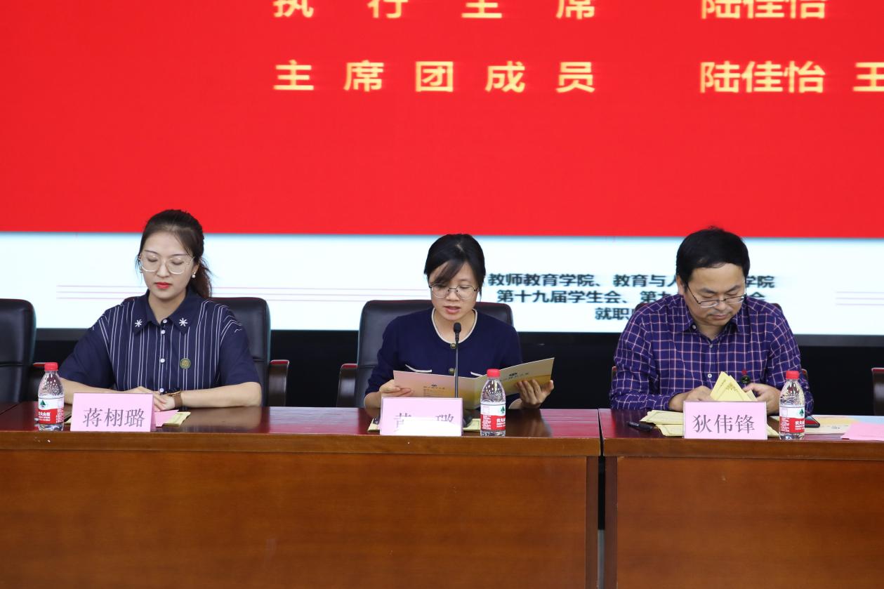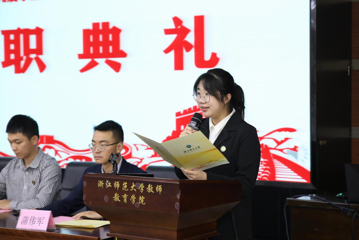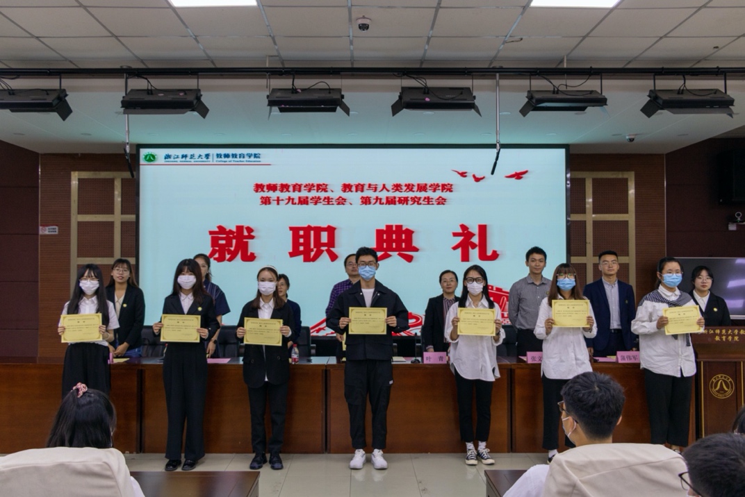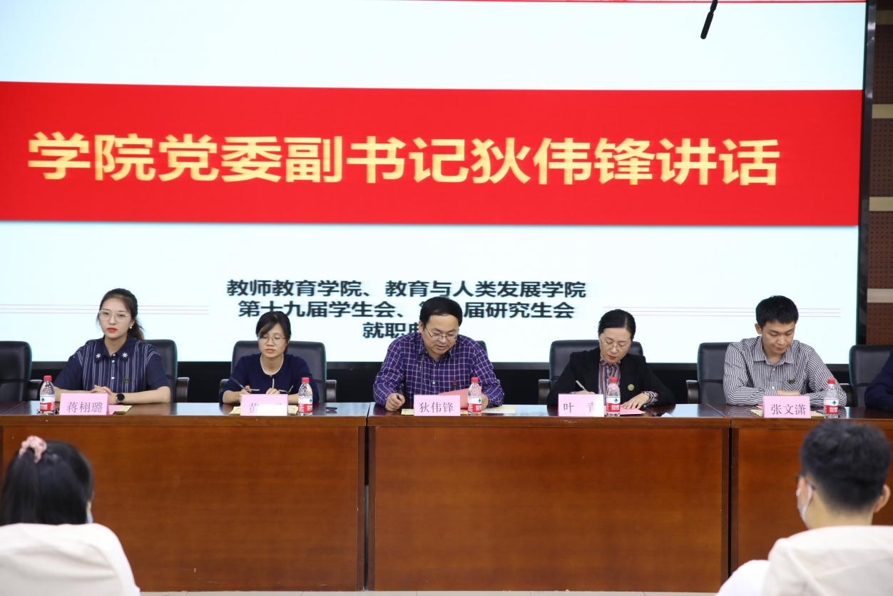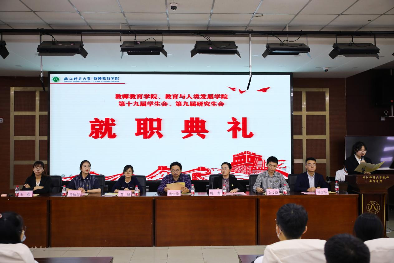 10月12日中午,浙江师范大学教师教育学院、教育与人类发展学院第十九届学生会、第九届研究生会就职典礼于17幢112报告厅顺利召开。院党委副书记狄伟锋,院团委书记兼学工办主任叶青,学工办辅导员黄璐、张文潇、蒋栩璐、蒲伟军、王萌老师出席本次活动,学院学生会、研究生会100余名学生干部参加典礼。
