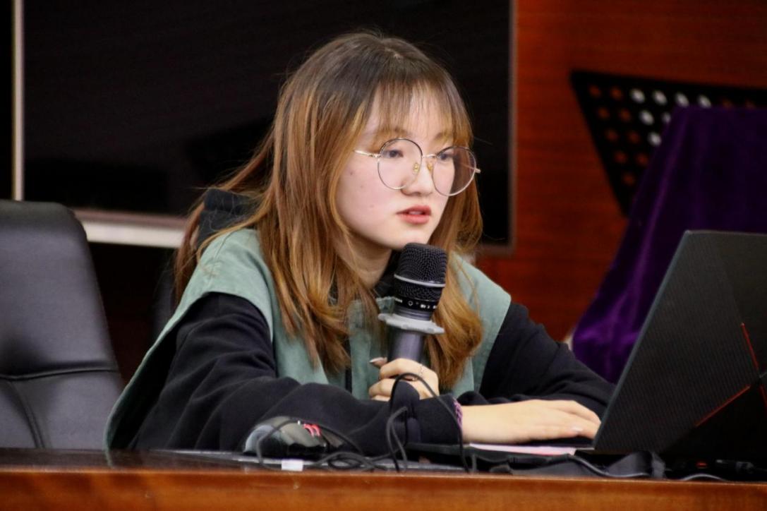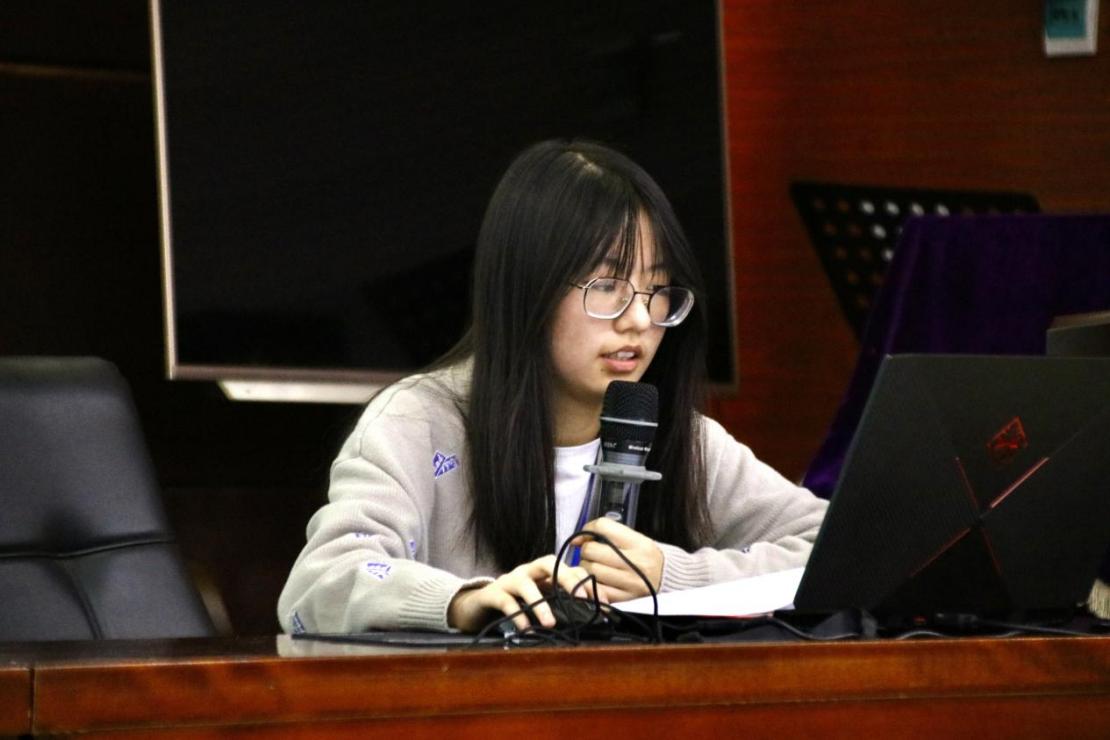 随后进行分享的是用相机快门声锁住美好瞬间,记录教师教育学院美好时光的摄影部。部门代表人应佳怡上台讲解了摄影技巧,以“人物”“运动”“后期”“感想”四点展开了有关摄影技能的分享,向大家讲述了她的拍摄经验。她侧重地讲到,摄影人应关注主要元素,掌握找准机位等主要技巧;同时,也应该具有强大的胆量,敢于站在台中央,穿梭于各个活动赛事的角落,以获得最佳的照片效果。