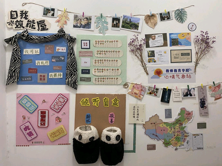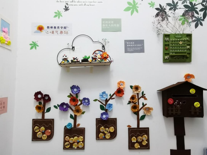 想要闻一闻清新花瓣的味道吗?那就来初阳F2-207寝室看看吧!寝室成员们将专业知识与心情气象站结合,整体风格以手工作品为主,构建了一个属于207成员们的情绪小花园。成员们首先将影响自己情绪的故事投递到信箱,信箱会在特定的时间开启。在经过寝室成员们的讨论之后,将相对应的情绪贴在自己的花盆上。一周后,成员们就会看到自己这一周的“心理花”,直观地展现这一周的情绪。如果一周都在经历比较负面的情绪,那么“心理花”就会是枯黄的,相反,则会是五彩斑斓的。207的成员们,借助这一朵朵 “心理花”,让自己的生活变得多姿多彩,同时也一直在作出努力,希望 “心理花”可以绽放出更加绚烂的模样。