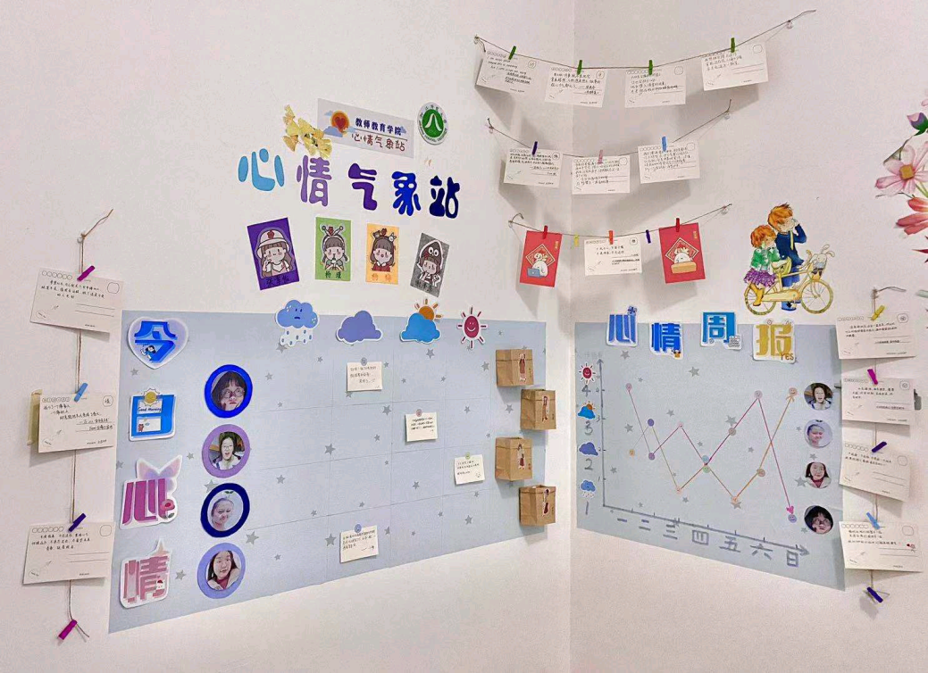 初阳F2-212寝室的心情气象站则以天空蓝为主色调,并点缀上了许多颗星星,意为四位成员在教育星空下的熠熠生光。心情气象站上展示了各位寝室成员们的大头贴,将每天的心情绘制成一周的周报,更加直观地展示一周中成员们心情起伏的变化。此外,寝室里还贴心地设置了心灵驿站,用一封封温柔的书信,一张张承载鼓励的小卡片的方式来互相交流情感,解决对方问题。