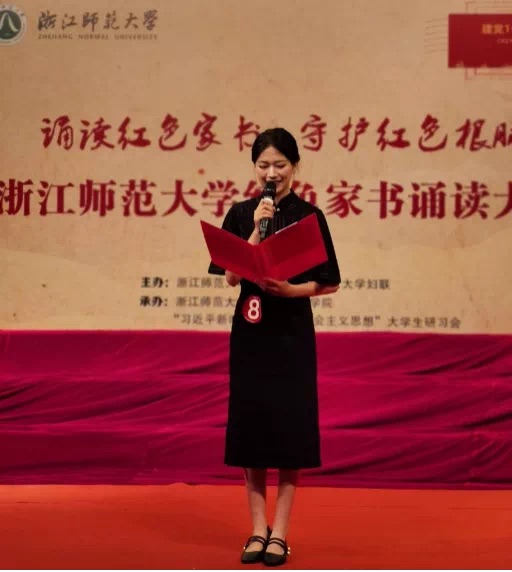 在刚刚过去的浙江省大学生中华经典诵读竞赛中,从去年四月,到今年十月,历时七个月;从校初赛、复赛、决赛,再到省初赛、决赛,她和小伙伴一起不断打磨稿子、练习即兴演讲。她由衷地感谢每一位帮助过她的老师,老师们细致而专业的建议和帮助让她收获颇丰,比如当对文本的情感把握不到位的时候,老师会帮助他们一起分析诗文内涵;在准备即兴演讲材料的时候,老师会帮助他们开拓思路。