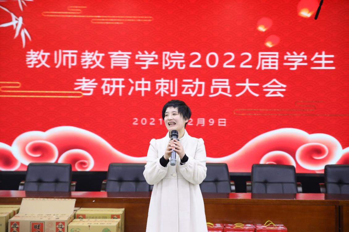 为关心我院2018级同学考研备考情况,调动备考积极性,增强考研信心,12月29日下午,教师教育学院2022届本科生考研冲刺动员大会在17幢112报告厅顺利举行。学院院长周跃良、党委书记查颖、党委副书记狄伟锋、副院长曹晓华、教务办主任施丽君、学工办主任叶青、年级辅导员张文潇等领导老师出席本次动员大会,为全体考研学子加油打气,送上温暖祝福。学院近百名考研学子参加了本次大会。