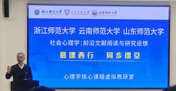 2021年12月29日下午,由浙江师范大学副校长李伟健教授领衔的“心理学核心课程虚拟教研室”在浙江师范大学16幢108教室成功举办第二次在线公开课,首次实现浙江师范大学、云南师范大学、山东师范大学三校同步课堂。本次在线交流围绕浙江师范大学孙炳海教授团队执教的《社会心理学》展开。