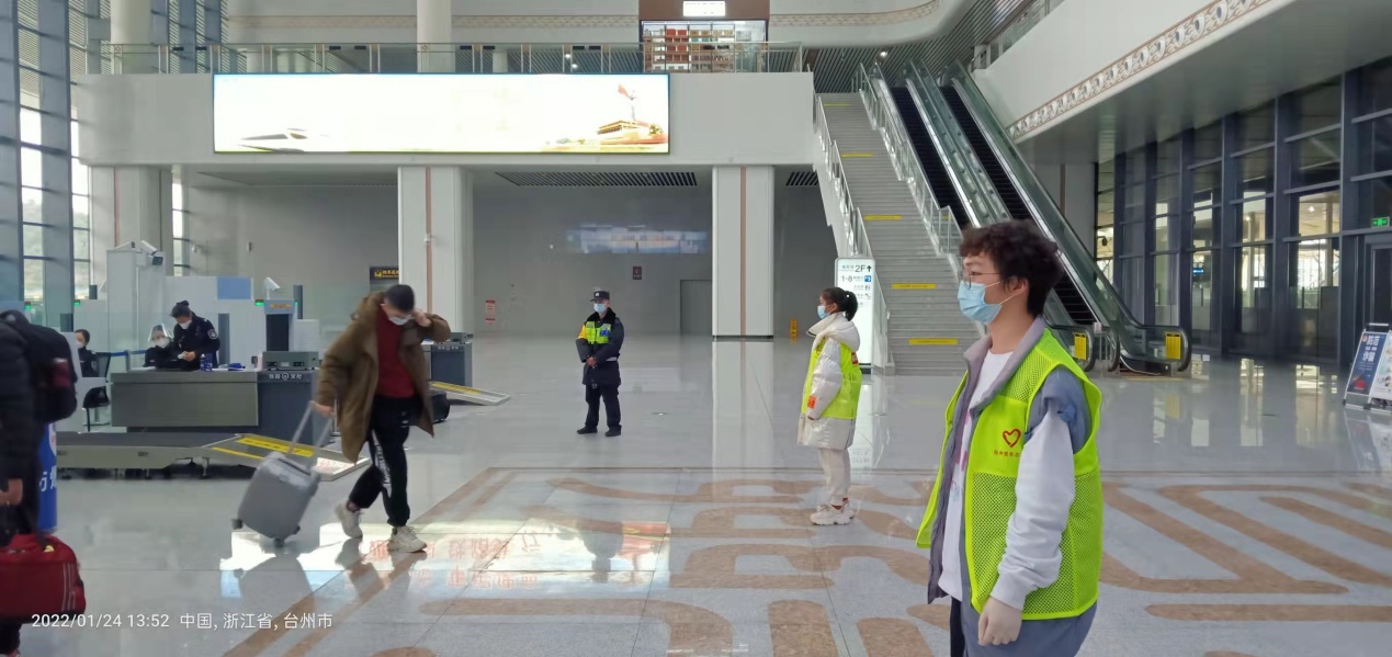 2022年1月24日,我在台州西站参加了寒假第一阶段的志愿服务。为了给返乡旅客提供更好的春运体验,我在高铁站负责疫情防控政策、通知及相关信息的宣传,协助登记、扫码、测温、留观,且根据形式的变化积极参与力所能及的服务,如为候车的乘客们发放防疫包、纸巾和窗花。