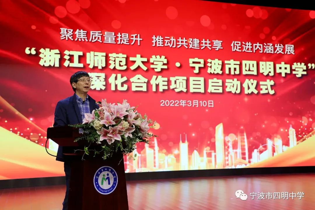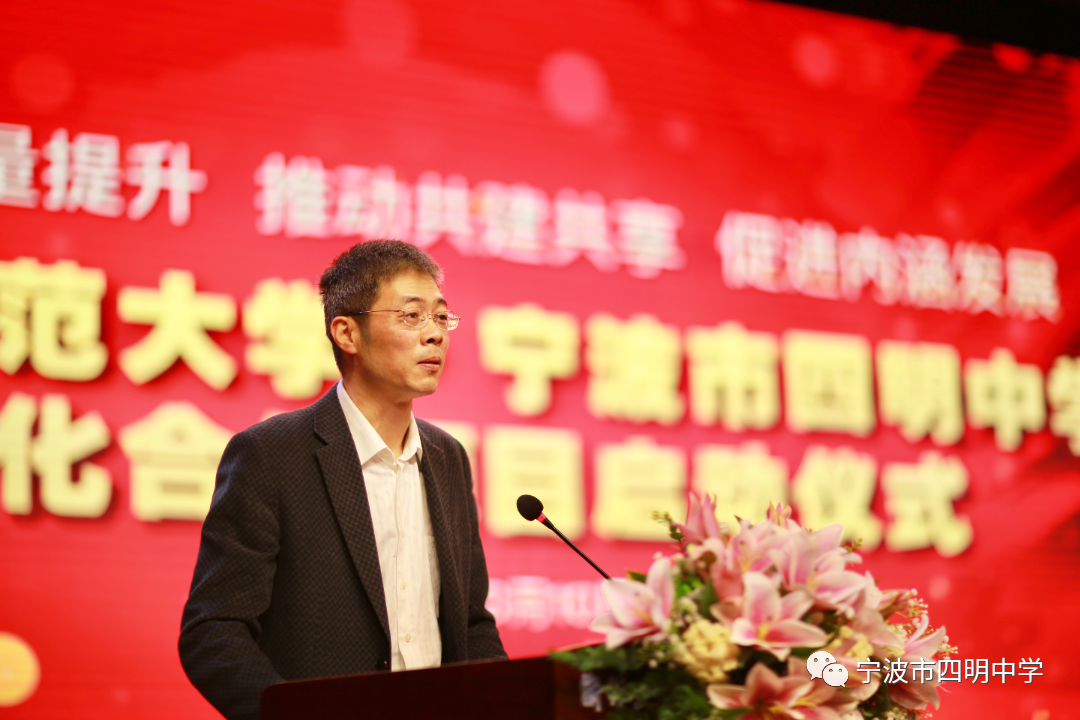 王飞代表宁波市教育局在致辞中指出,宁波市四明中学教育实验研究项目是宁波市教育局与浙江师范大学在基础教育领域协同创新战略合作中的一件大事、一件喜事。双方合作要坚持两个“下功夫”:一是要在“精准”上下功夫,严格质量标准,严守质量控制;二是要在“提升”上下功夫,争取在党建引领、立德树人、教育质量、教育改革、服务发展和防范风险等六个方面走在前列,真正做到内涵发展,切实提升宁波市四明中学在宁波市民心中的美誉度。