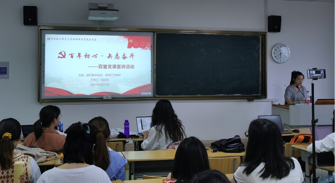 为提高党员党性修养,赓续革命先烈红色精神,5月21日晚,教育技术学硕士研究生党支部书记陆佳怡于16幢304B教室以“缅怀革命先烈,传承红色精神”为主题,为全体党员上了一堂生动的党史学习课。