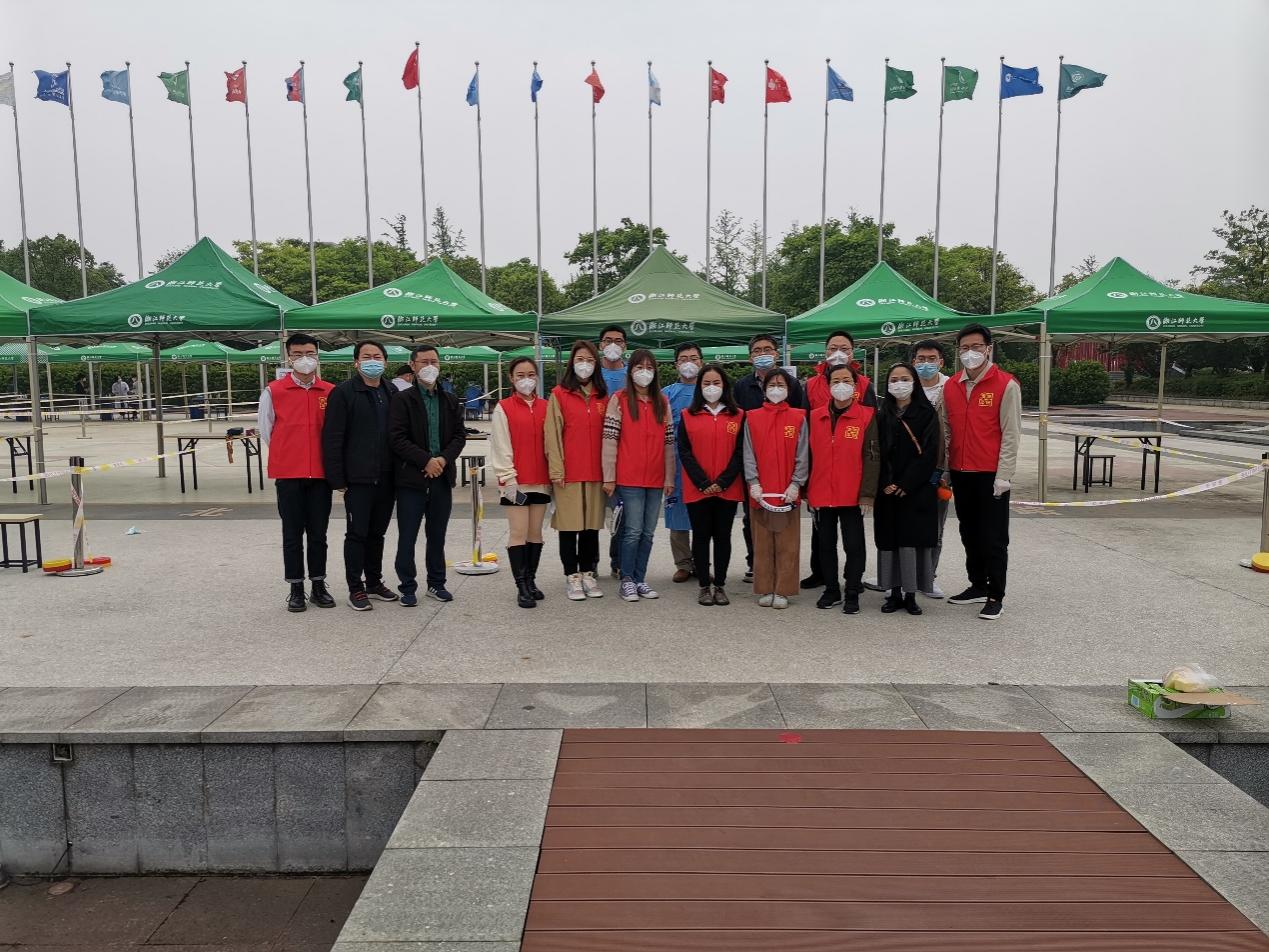 图为行政教工党支部志愿者、全体辅导员防疫工作结束合影