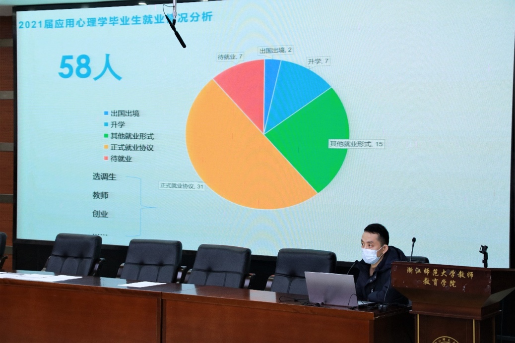 喻松老师则罗列了2022届毕业生就业情况,并以饼图的形式展示了17级心理专业与教育技术专业学生的毕业去向,鼓励同学们尽早做出自己的选择。随后,他为同学们讲解了各地的引才计划、就业策略,提供了诸多就业信息获取的网站,同学们在听讲的过程中都收获颇丰。