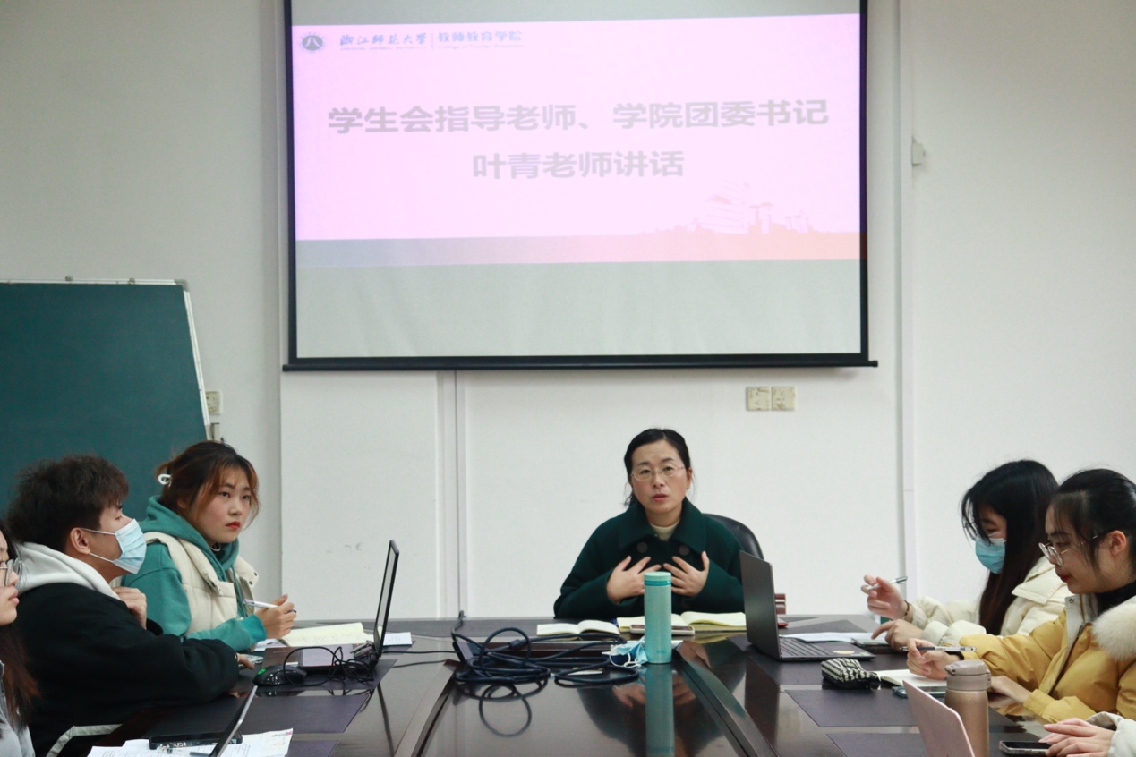 叶青老师对2021年度学院团学工作取得的成绩给予肯定,对团学干部付出的辛劳表示感谢,提出团学各部门要围绕学校中心工作,打造一支青春向上、朝气蓬勃的团学队伍,共同谱写未来属于自我的新篇章。同时叶老师对述职内容和相关部门工作提出建议,帮助学生会理清工作思路,进一步明确了下一步学生会的任务与目标。此外,她还提到,正值学期末,目前最重要的是准备期末考试,相信同学们可以平衡好工作和学习之间的关系,当下努力投入学习,在未来以更饱满的状态投入工作中。