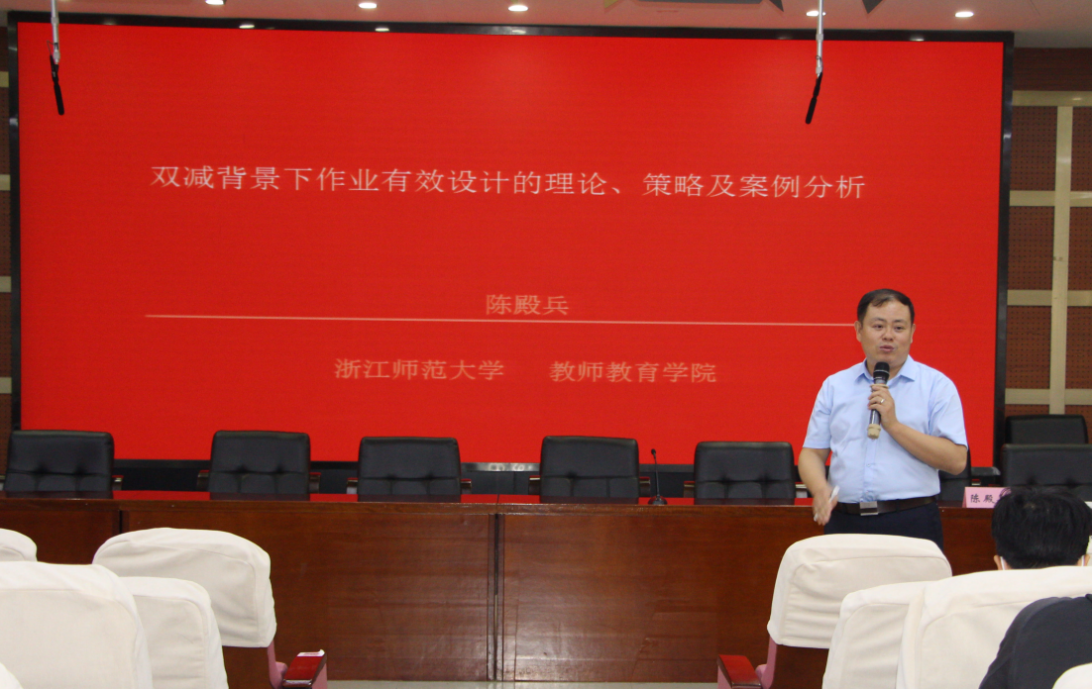 开班典礼后,浙江师范大学教师教育学院副教授陈殿兵作《“双减”背景下作业有效设计的理论、策略及案例分析》专题讲座。陈教授富有诗意又不乏幽默的讲述,深深感染了在座的每一位教师。会后,教师们展开了热烈讨论,进一步明确了“双减”背景下教育教学的目标。