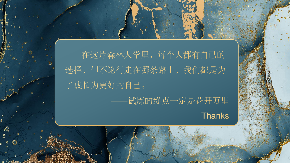 最后,张秦涵向同学们分享了她的直博收获:跳出舒适圈、变得更自信,开阔眼界,保持热爱,成就了更好的自己。“在这片森林大学里,每个人都有自己的选择,但不论行走在哪条路上,我们都是为了成长为更好的自己。试炼的终点一定是花开万里。”这是她对自己的肯定,也是对同学们的鼓励。