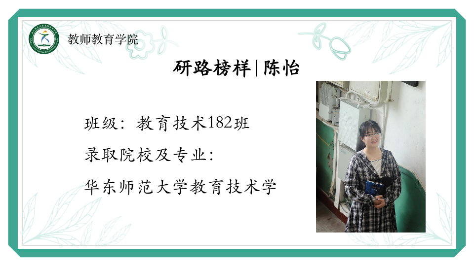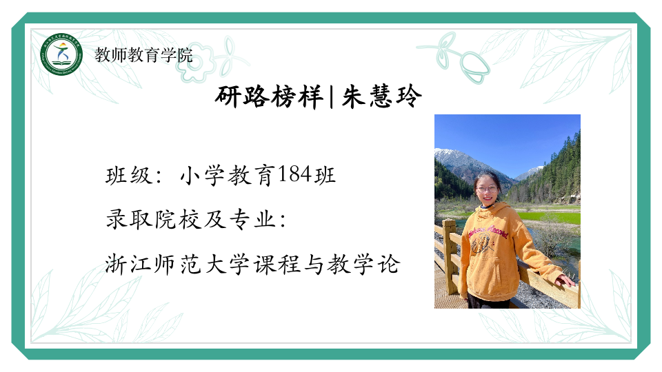 朱慧玲,小学教育184班,现已成功保研浙江师范大学课程与教育论专业。