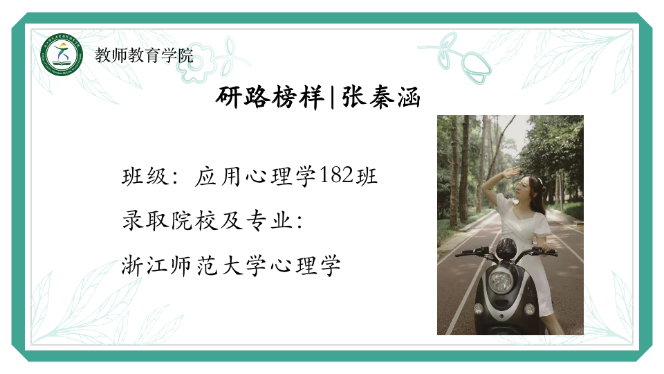 张秦涵,来自应用心理学182班,现已成功保研浙江师范大学心理学专业。