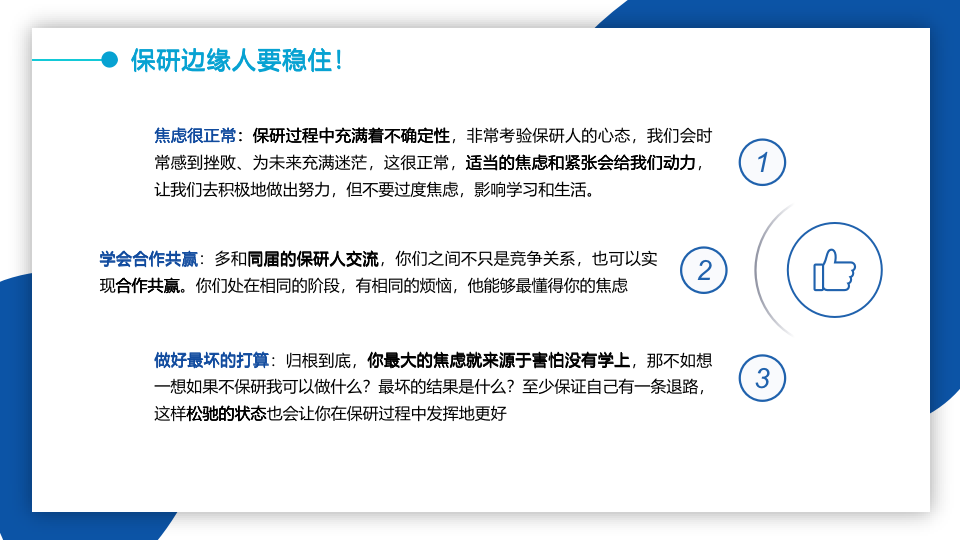 朱慧玲从“通知解读”“面试准备”“后期事项”三方面分享了她的保研经验。朱慧玲着重强调了面试方面的准备:自我介绍可围绕学生工作、学科竞赛、学习成绩、支教初心等内容展开;即席演讲/结构化面试则围绕支教初心、自我优劣势、教学机智等问题展开回答;现场问答要大方、从容、有逻辑。最后,她还向同学们分享了面试三原则:着装得体清爽,语言清晰有逻辑,行为大方从容。