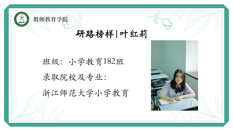 叶红莉,小学教育182班,现已成功保研浙江师范大学小学教育专业。