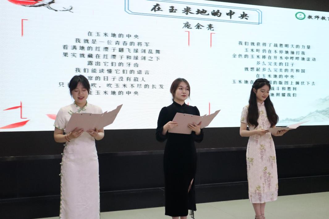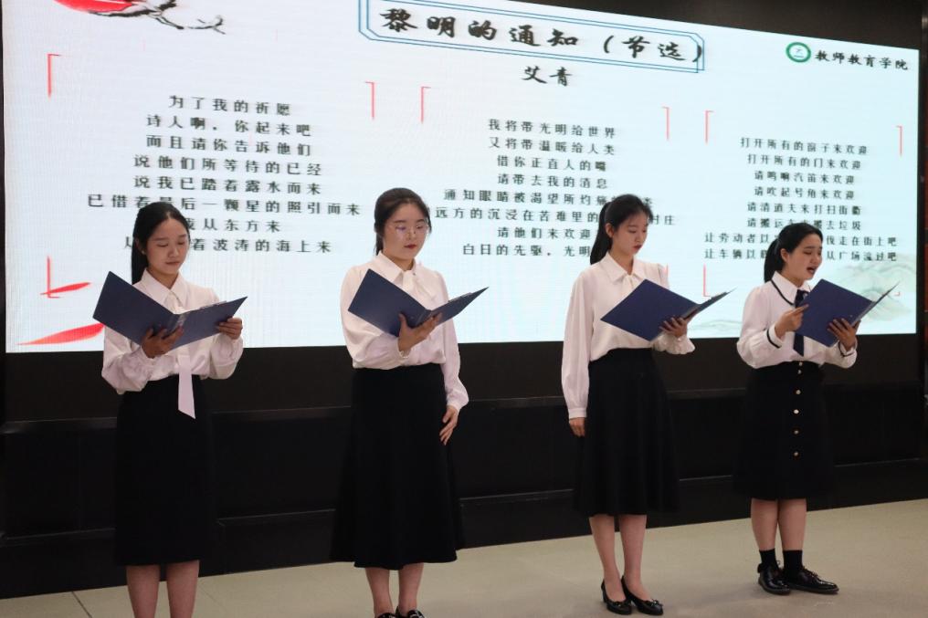 百年激情冲云霄,亿万梦想缀山川。华夏风采今胜昔,炎黄子孙谱新篇。百年来,中国共青团在中国共产党坚强的领导下,接受了血与火的考验,经历了风和雨的洗礼,取得了无数伟大业绩。为喜迎中国共青团建团100周年,展现教院学子爱国之情与独特风采,5月20日晚,我院“青春如诗,百年芳华”经典诗文朗诵赛决赛在17幢112报告厅顺利进行。
