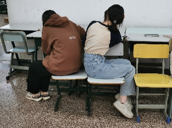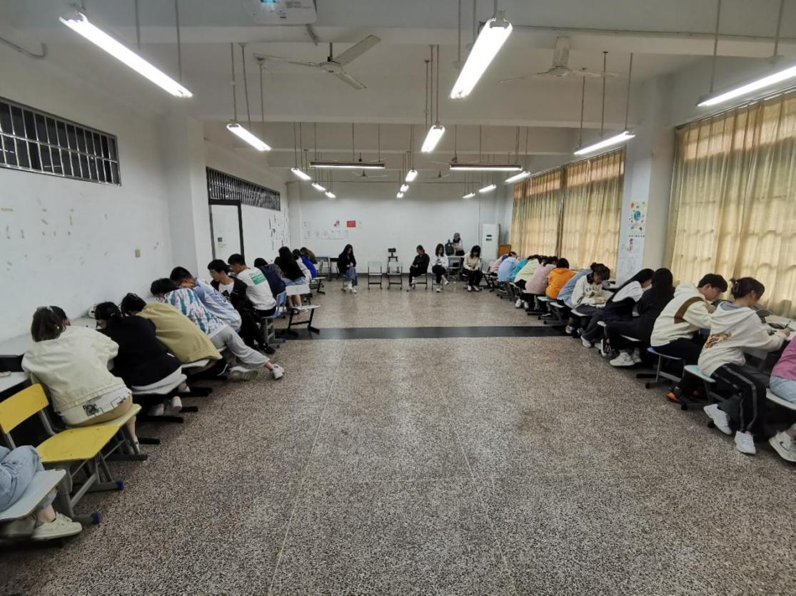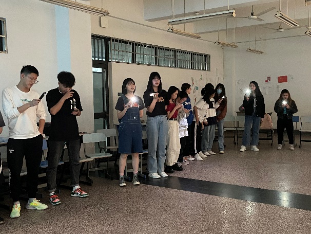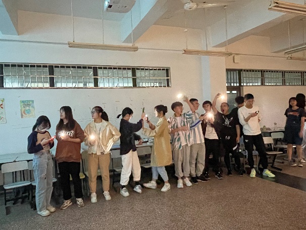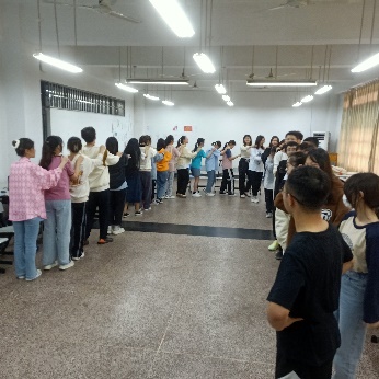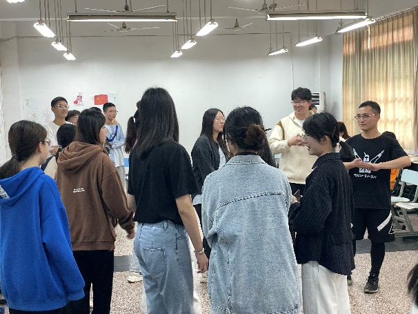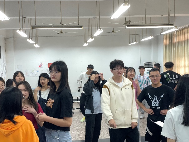 用沟通搭起心灵的桥梁——这是第二次的团辅,是一段建立信任的旅程。什么是信任?或许就是可以把背后托付给对方。在班长的带领下,身后闭着眼的同学们搭着身前同学的肩膀,在黑暗中勇敢地前行着,开呀开,一列长长的小火车就这样上路了。