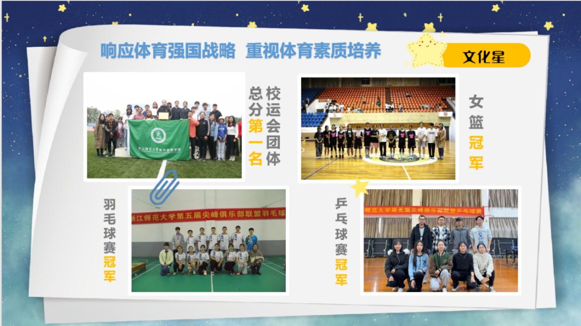 文化活动齐开放,素质拓展共并行。“文化星”闪耀在各类文体活动的第一线,在它的引领下,我院学风建设同样得到助力——今年教院考研率突破新高,并成功与中国人民大学联办了云端读书会等精彩活动。与此同时,学生会也重视教育学子体育素质的培养,推动学院在各类体育竞赛均拔头筹。