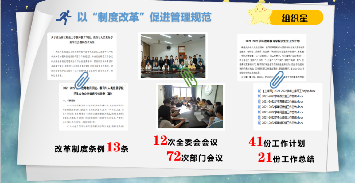 思想建设举旗帜,教育队伍立标杆。“组织星”的光芒来源于学生会完备的制度建设与牢固的思想建设,教育学院学生会保持精简的干部队伍,以制度改革促进管理规范,以组织建设创新培养方式。同学们在学生会招新、学生会就职典礼、学生会述职大会等场合,都可以见到“组织星”忙碌的身影,推进学生服务工作,真正做到了“让党放心,让同学满意”。