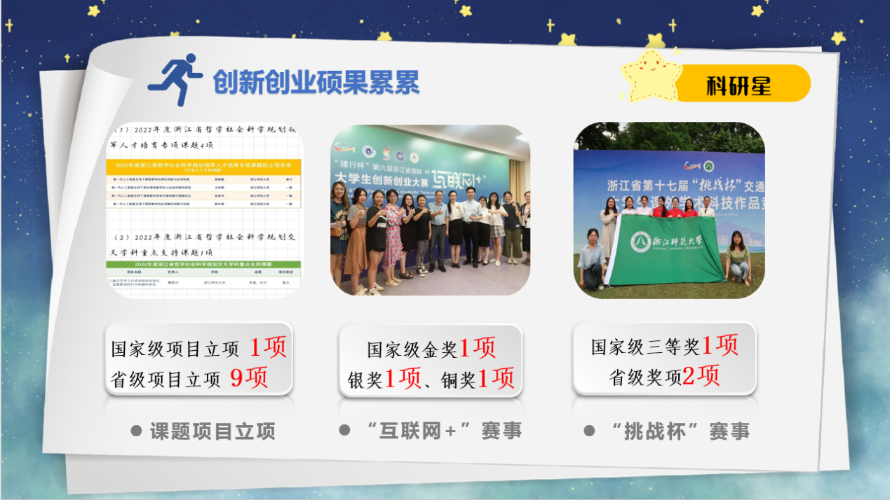 科研赛事获佳绩,教育创新长才干。我院深入丽泽创新书院建设,继续打造“本硕博”三级互助小组,持续提升学院师范生科研能力。2021-2022学年,我院学生获省级以上立项10项,以及“互联网+”国家级金奖、银奖,“挑战杯”国家级三等奖等众多奖项。