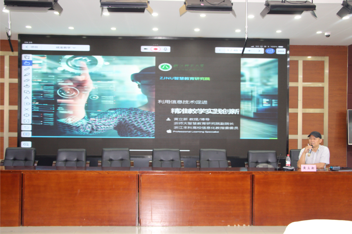 开班典礼后,浙江师范大学智慧教育研究院副院长黄立新教授作《利用信息技术促进精准教学实践创新》专题讲座。黄教授围绕学生学了吗,怎么学的,学的怎样等问题开展富有诗意又不乏幽默的讲述,深深感染了在座的每一位教师。会后,教师们展开了热烈讨论,进一步明确了在开展精准教学过程中信息技术的重要作用。