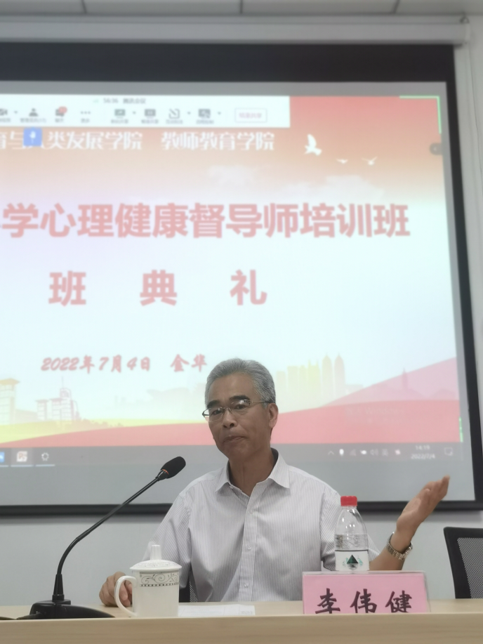 李伟健副校长代表浙江师范大学以及浙江师范大学心理学学科对各位培训老师的到来表示热烈的欢迎,同时也对到来的所有专家授课老师表示衷心的感谢。浙江师范大学是一所以教师教育为特色的综合性省属重点大学,教师教育学院也始终坚持立德树人根本任务,形成了从本科生、硕博研究生到博士后完整的人才培养体系。李校长指出,健康督导师培训班是浙江省中小学心理健康教育再上一个台阶的重要举措。李校长表示因为疫情原因,今年推迟举行督导班的培训,但督导班要保持严格的标准,才能对整个浙江省心理健康教育质量负责。
