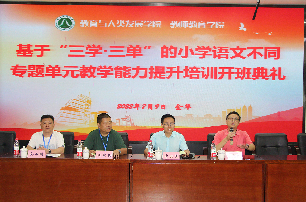 7月9日下午一点,浙江师范大学教师教育学院举办了基于“三学·三单”的小学语文不同专题单元教学能力提升培训的开班典礼,浙江师范大学教育学院院长助理李云星、衢州市开化县研训中心副主任汪家良参加开班典礼并讲话,开班典礼由教师教育学院社会服务中心主任杨光伟主持。此次,开化县117名小学语文骨干教师参加培训。