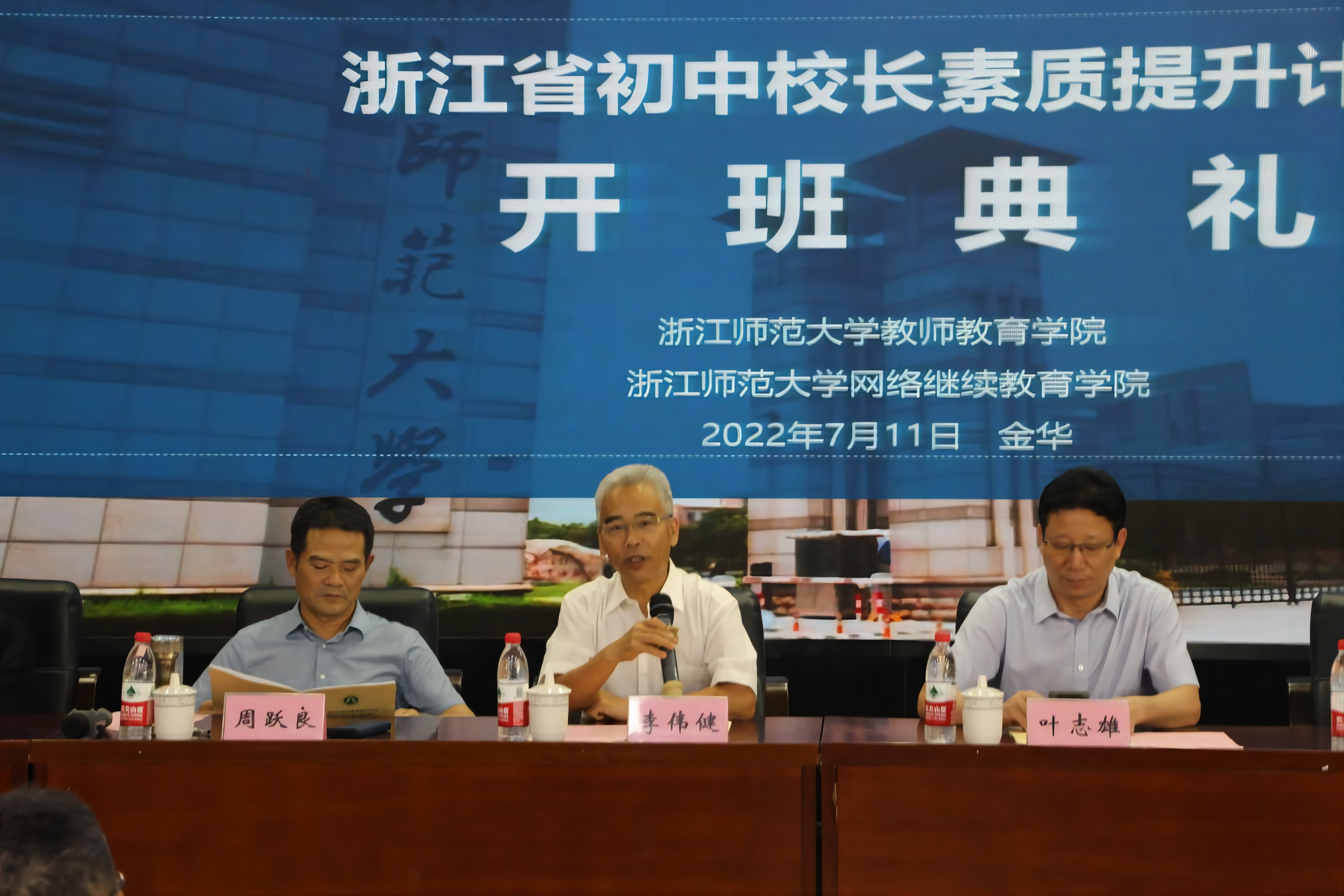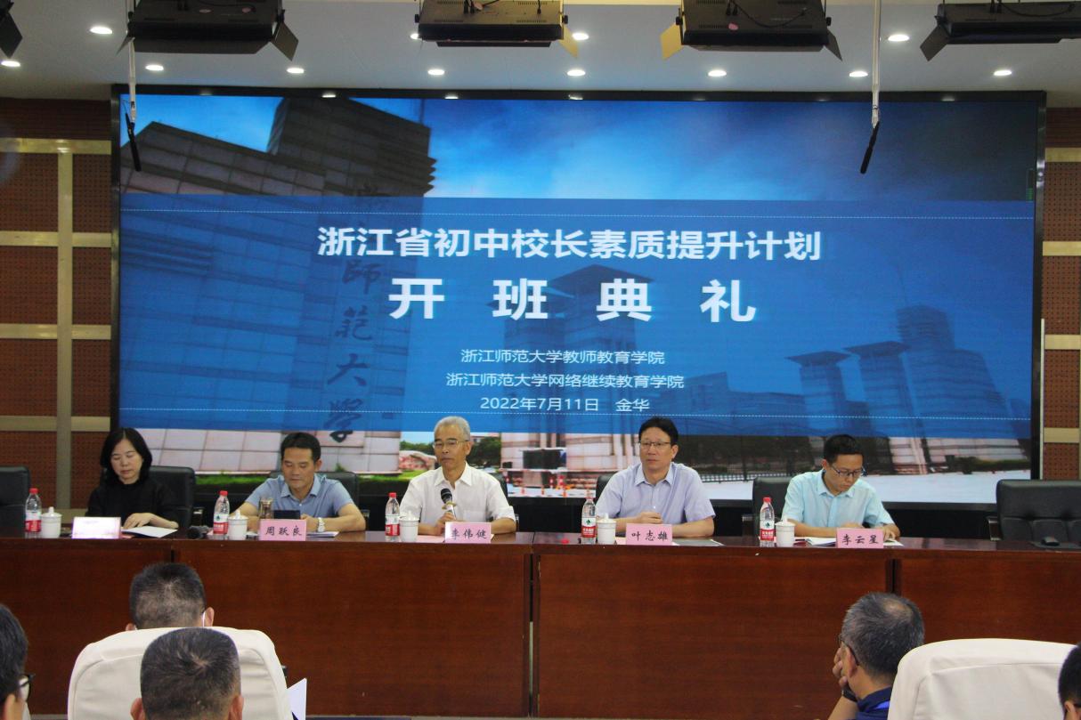 7月11日下午14:30,开班典礼在教师教育学院17幢112报告厅举行,浙江师范大学副校长李伟健、浙江师范大学教师教育学院院长及项目首席专家周跃良、浙江师范大学教师教育学院院长助理及项目负责人李云星、浙师大高质量育人综合改进研究中心副主任费蔚出席典礼,开班典礼由浙江师范大学继续教育管理处处长叶志雄主持。
