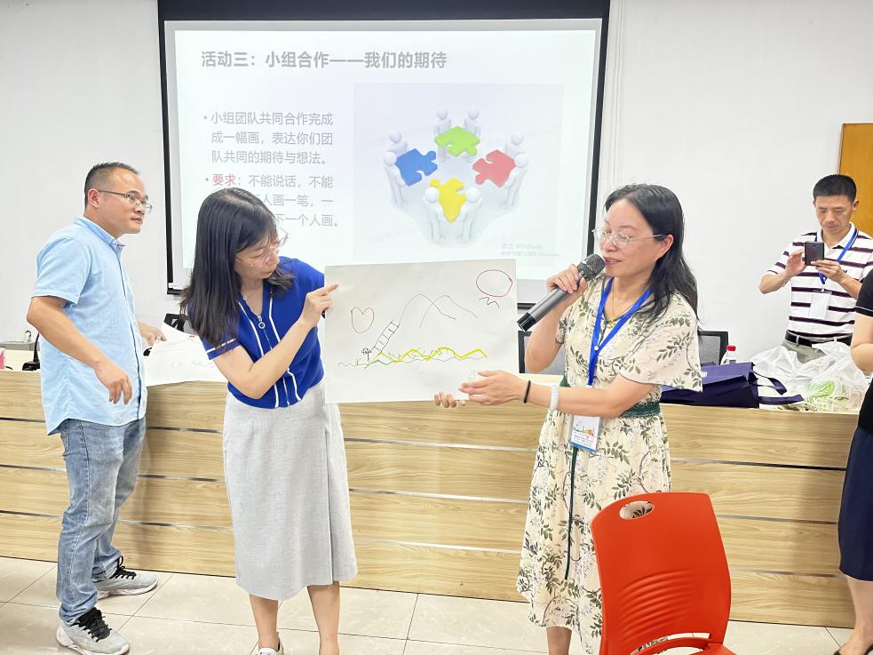 三班学员在不说话不讨论的情况下,小组成员共同完成一幅画来表达团队共同的期待,过程考验了团队成员们的默契度和创造力,小组展示促使了学员们对教育理念进行共享。大家各抒己见,氛围融洽。其中一组学员在组长第一笔波浪之后配合默契,在画中生动展现了“教育需要宁静与登高并重”的理念。