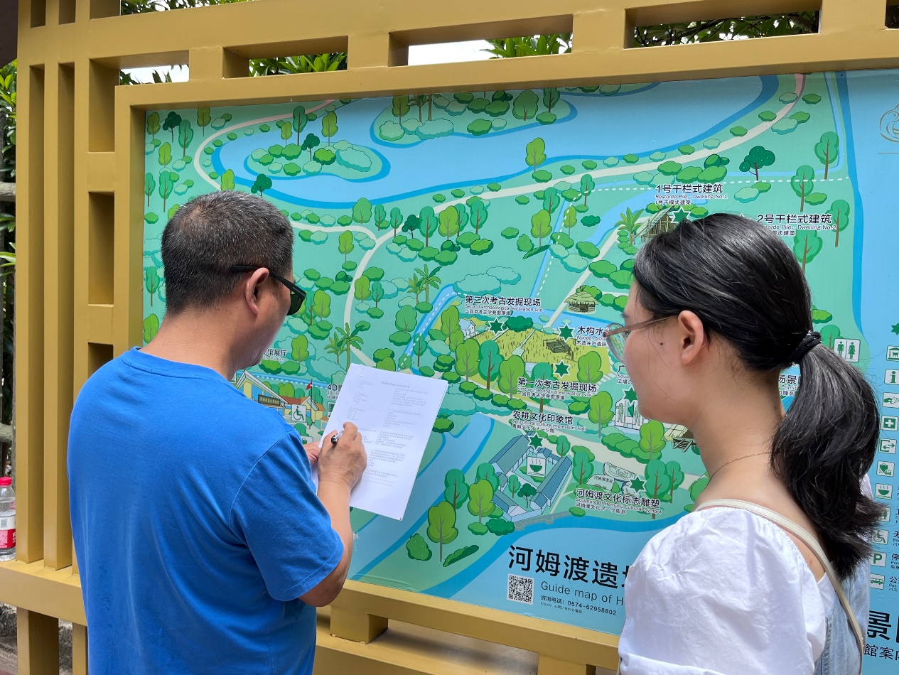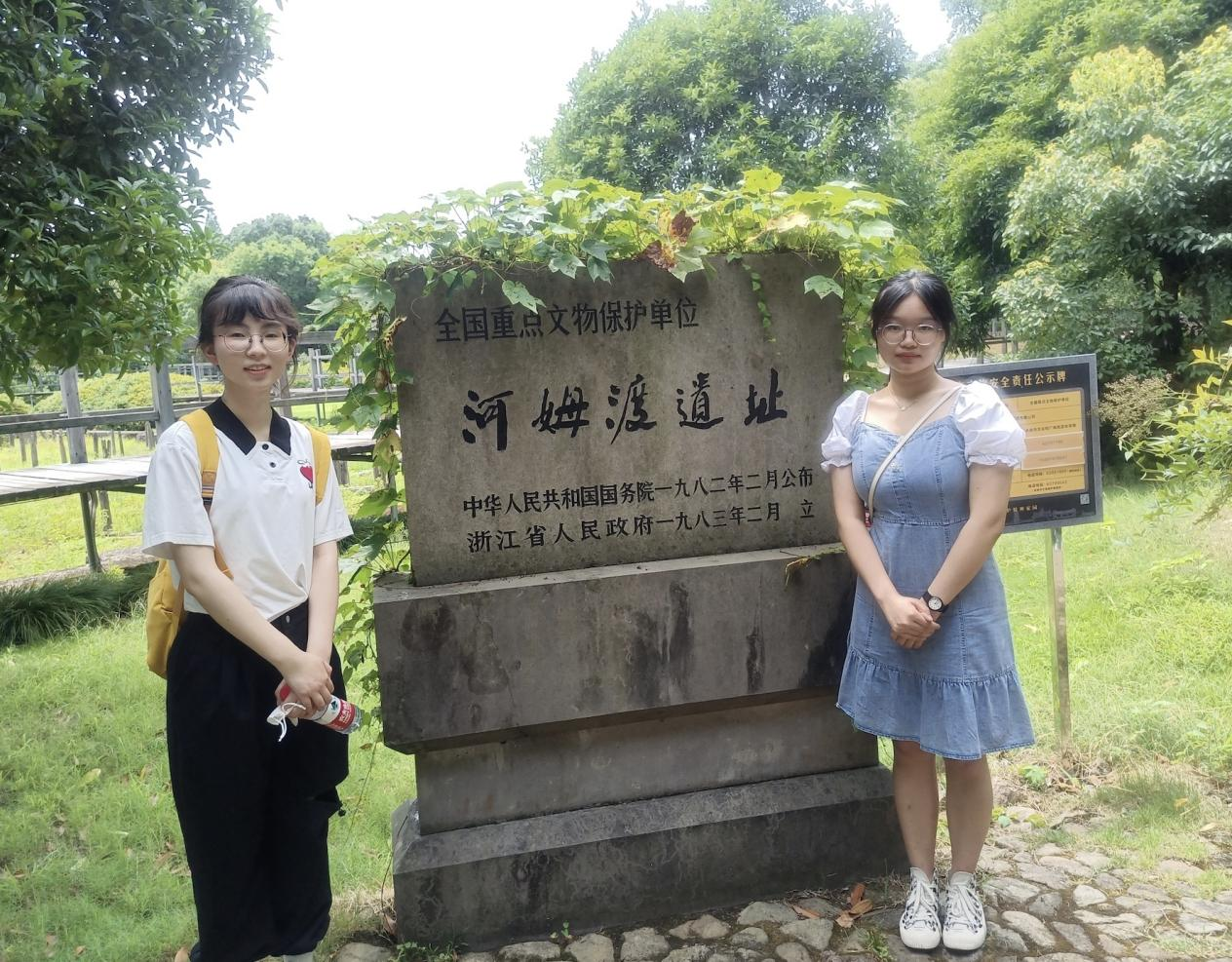 在问卷调研后,实践队成员前往了河姆渡遗址博物馆进行实地考察。通过观察考古出土的金枪鱼脊椎骨、带切割痕迹的鹿角,队员们仿佛看到了在几千年前的丘陵山地上,大象、犀牛等大型哺乳动物出没其间;看着河姆渡原始人民用箭射鱼,用骨耜开垦成片的水稻田,也体会到了原始社会的人们自给自足、用劳动创造未来的快乐。研究河姆渡原始居民居住的干栏式建筑和于垂直点使用的榫卯结构,队员们不禁感叹于他们的智慧,想象着他们穿针缝衣、舟楫穿梭、饭稻羹鱼的定居生活。经过几日的实地考察,大家对河姆渡文化有了更深入的了解,也对在余姚地区将河姆渡文化融入劳动教育更增添了一份信心。