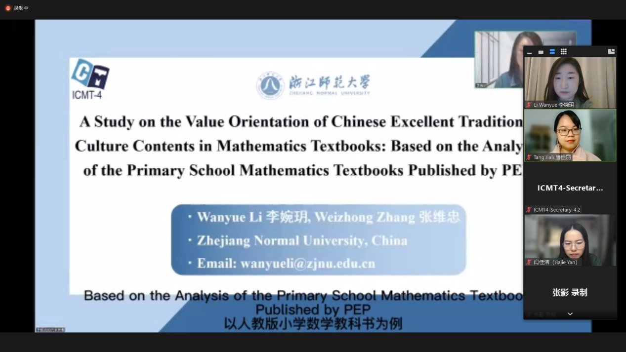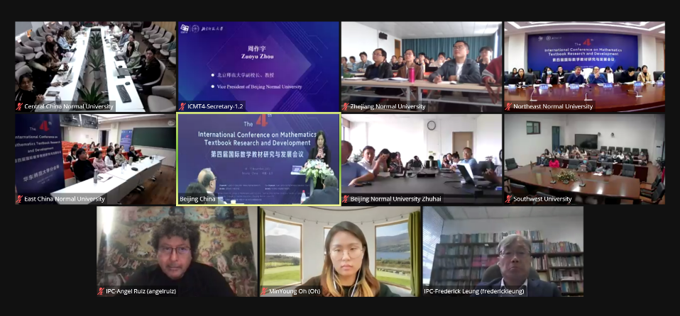 2022年11月14—17日,第四届国际数学教材研究与发展会议(ICMT-4)于北京师范大学顺利召开。该会议是国际数学教材研究领域最重要的综合性学术会议,继英国、巴西和德国之后,首次在中国召开。本次大会持续4天,收到了113篇论文,来自中国、美国、英国、日本、韩国、德国、巴西、以色列、荷兰、挪威、新西兰、印度尼西亚、菲律宾等20多个国家的400多位数学教育工作者齐聚此次盛会,通过5场大会报告、4场专题研讨、1场工作坊、68个口头报告及7个海报展示,共议数学教材研究的诸多重要研究方向。本次会议采用线上线下相结合、主会场与分会场相联动的方式,实现多地域和跨时区交流,开闭幕式向全球直播,大会报告同时在主会场和6个分会场组织线下收看。浙江师范大学教师教育学院17幢718会议室是此次会议重要的分会场之一,我院张维忠教授、唐恒钧教授、陈碧芬副教授、徐元根副教授、白改平副教授等老师及数学教育相关专业的四十余名硕博研究生线上参与了此次会议。