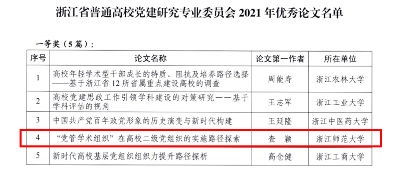 近日,浙江省普通高校党建研究专业委员会公布2021年优秀论文名单,教师教育学院党委书记查颖带领团队撰写的《“党管学术组织”在高校二级党组织的实施路径探析》荣获一等奖。
