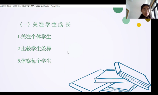「姚老师刚开始用自己的亲身经历说到教师要不断的主动学习,要不断提升自己的综合能力,就能收获惊喜。姚老师给我们介绍了自己培养这个天天写班级日记的过程。老师还介绍了最近通过自己的班级日记,产生的自己的思考。“教师要少一些表扬和批评,多一些肯定和引导。要注重提升学生学习的内驱力,因为靠表扬学习的学生又不远的,因为不会有人一直关注你,鼓励你。”这两句话非常触动我,因为我们经常会忽略学生的内驱力,特别是新入职的老师可能会更在乎自己的课堂评价,对学生的评价有没有到位之类的。姚老师记录的这些班级日记后来又整理出版,收到了很多人的鼓励和表扬。老师也感觉到自己的努力是有用的,有价值的。而且姚老师在写班级日记过程中在不断改进和思考进步。