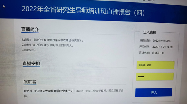 为全面贯彻习近平新时代中国特色社会主义思想,深入学习党的二十大精神,加强研究生导师队伍建设,提高研究生导师综合素质和指导能力,福建省学位委员会、福建省教育厅委托国家教育行政学院举办“福建省高校研究生导师培训班”。12月21日下午,我院党委书记俞明祥受邀为参训研究生导师学员作题为《研究生教育中的课程思政建设与实践》的专题讲座。