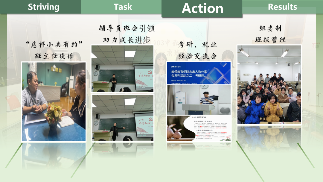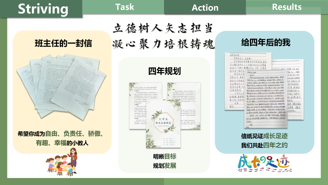 班级同学在陈老师的指引下,通过“班主任的一封信”、“四年规划”、“给四年后的我”等形式,成班风,立大志,书规划;以“全员”为基础,让每个同学都有出彩的机会;以“全过程”为核心,四年一贯制锤炼师范生核心素养;以“全方位”为落脚点,五育融合,立志成为“大先生”。