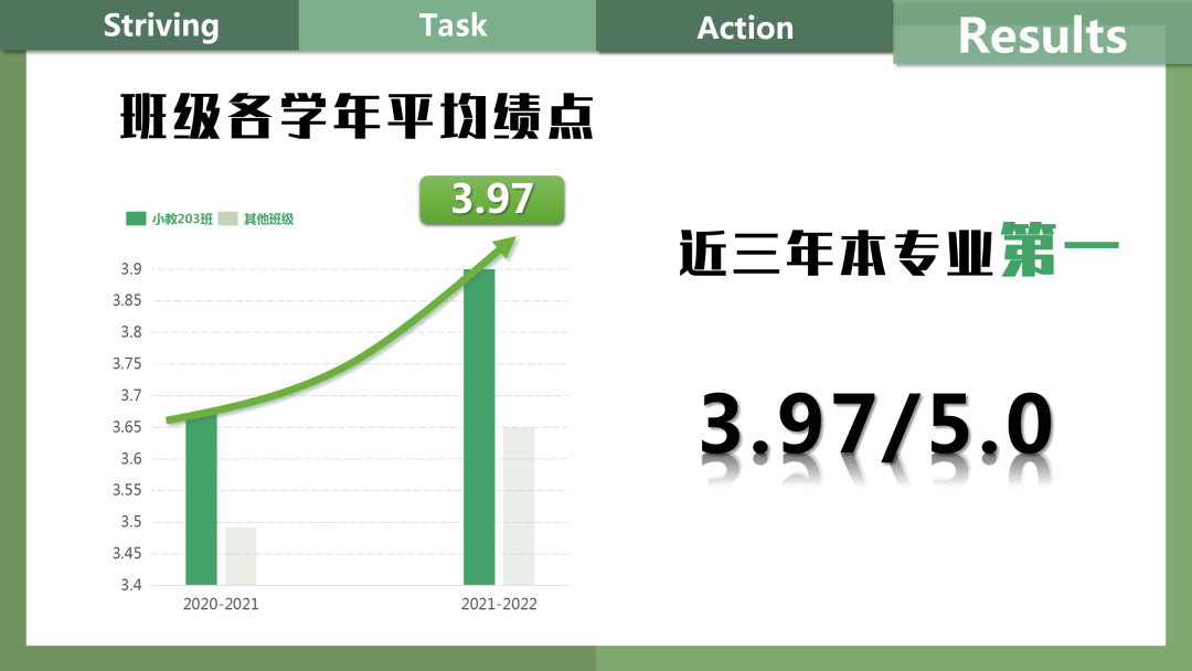入学以来,班级同学的平均学分绩点稳步提升,大二学年达3.97,斩获近三年本专业第一的殊荣,英语四六级通过率屡创新高,升学深造意向率达87.5%。