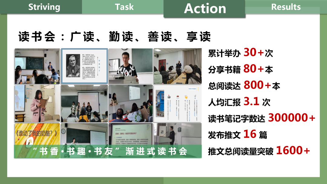 同学们于特色化探索中升华。在 “大一感知体验”“大二同课异构”“大三多面浸入”“大四全能升华”的浸润型实践模式下,班级创研“砺师能,展师风”的二次备课制。在累计举办近20次的活动中,通过二次试课磨课,绽放属于自己的教育之花。秉持“书香•书趣•书友”渐进式理念,从大一至今定期举办读书会,累计举办读书会 30 余次,分享书籍 80 余本,人均汇报 3.1 次。