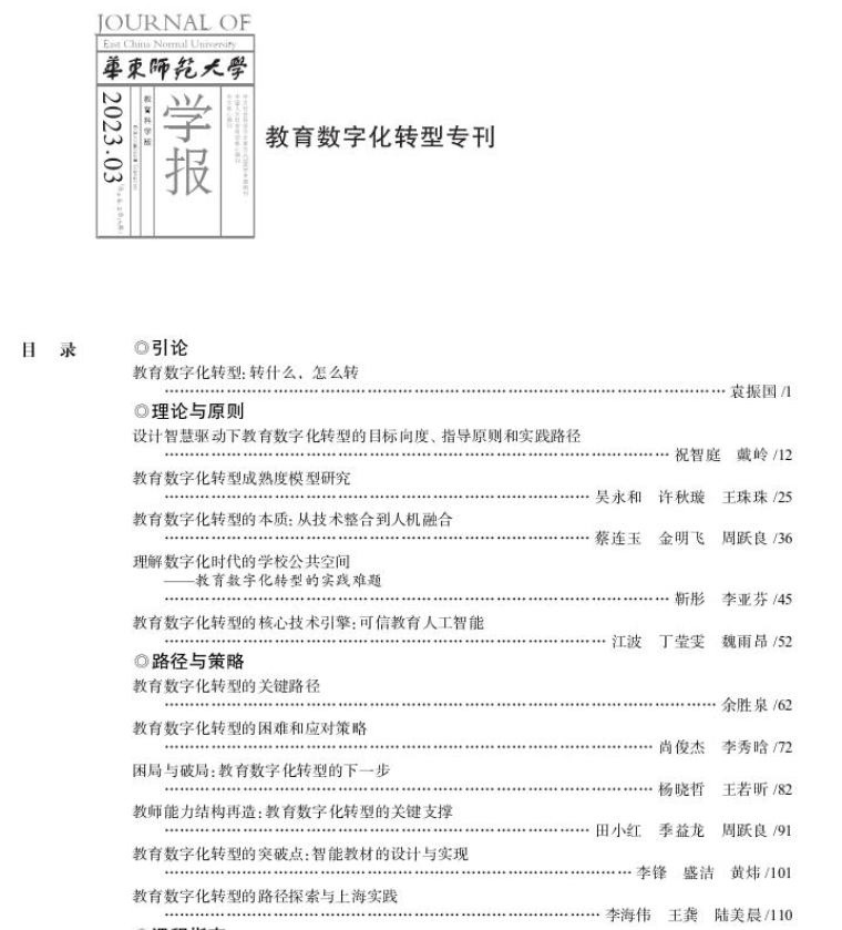 近日,教育学院田小红、季益龙、周跃良在《华东师范大学学报(教育科学版)》2023年第3期刊发题为“教师能力结构再造:教育数字化转型的关键支撑”的研究论文。华东师范大学学报(教育科学版)本期系教育数字化转型专刊,刊出了国内教育数字化转型资深专家学者探讨我国教育数字变革路径的系列论文。