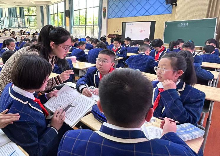 浙师大三名见习生上台参与卷入式教学研讨活动,学习借鉴优点,虚心提出疑惑并请教。张副对陈老师的课堂教学给予高度评价,也从深挖文本价值、发挥学生主体地位等角度对陈老师的课进行点评,认为应突出侧面描写,将把文本价值发挥到最大化,进行深入拓展,从课内走向课外。金副认为浙师大见习生观察细致入微,鼓励与指导老师积极沟通。本次常规语文教研互动多方参与,其各抒己见,肯定优点,指出不足,氛围融洽,其乐融融,共促课堂之发展。