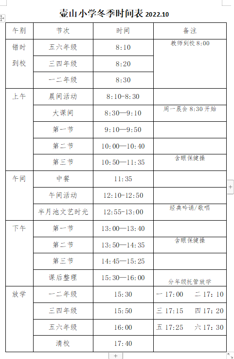 (二)工作时间为8:10-17:30,具体作息参照壶山小学冬令时间表;